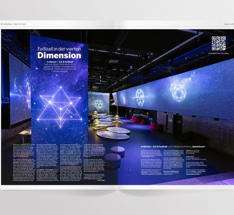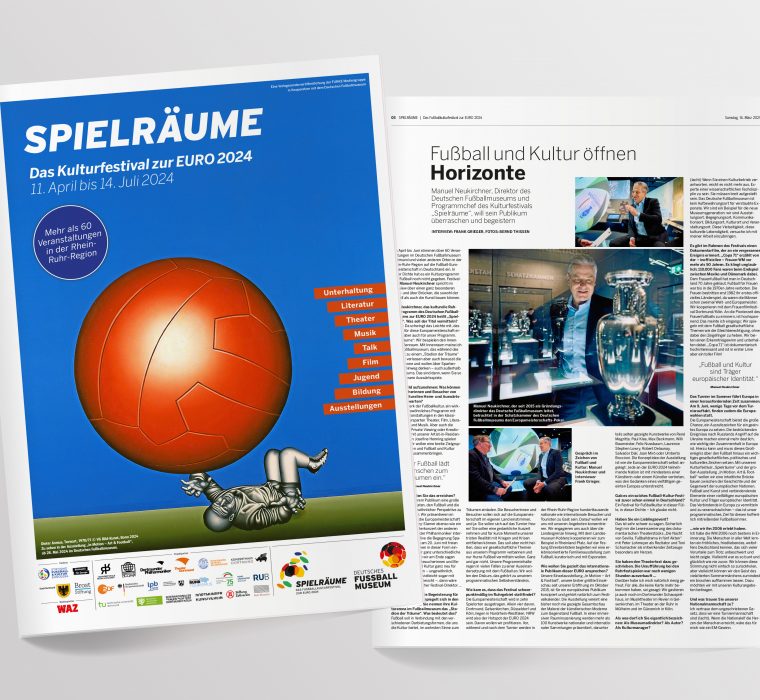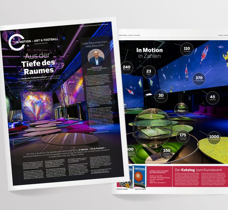 Für das Fußballmuseum in Dortmund wurden in Kooperation zusammen mit dem Ruhr Museum drei Beilagen entwickelt, die unterschiedliche Ausstellungen sowie die Multimedia-Schau „In Motion – Art & Football“ ankündigen und das Kulturfestival zur EURO 2024 vorstellen.