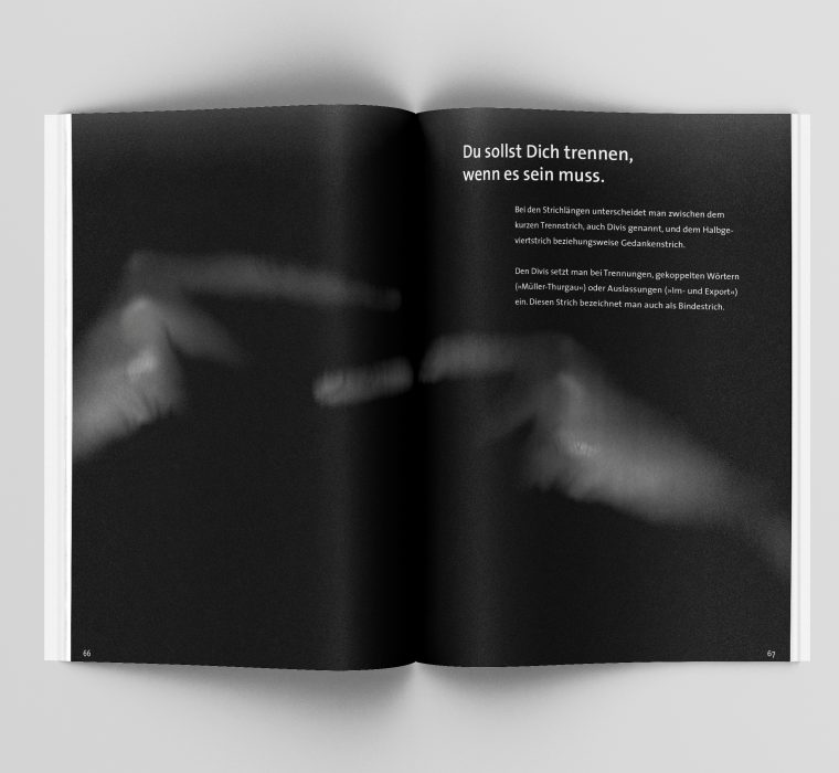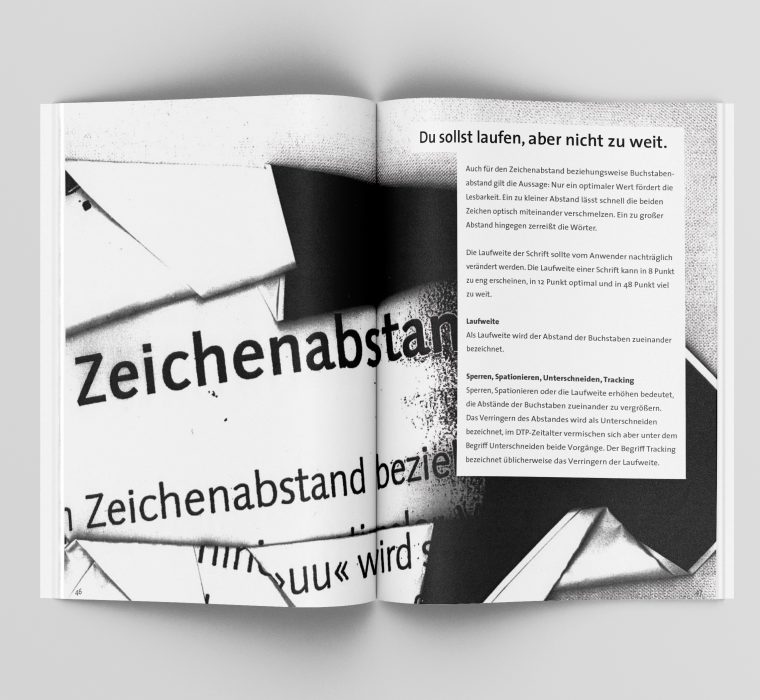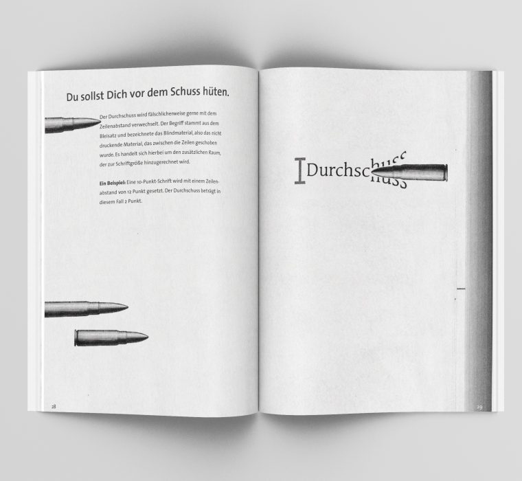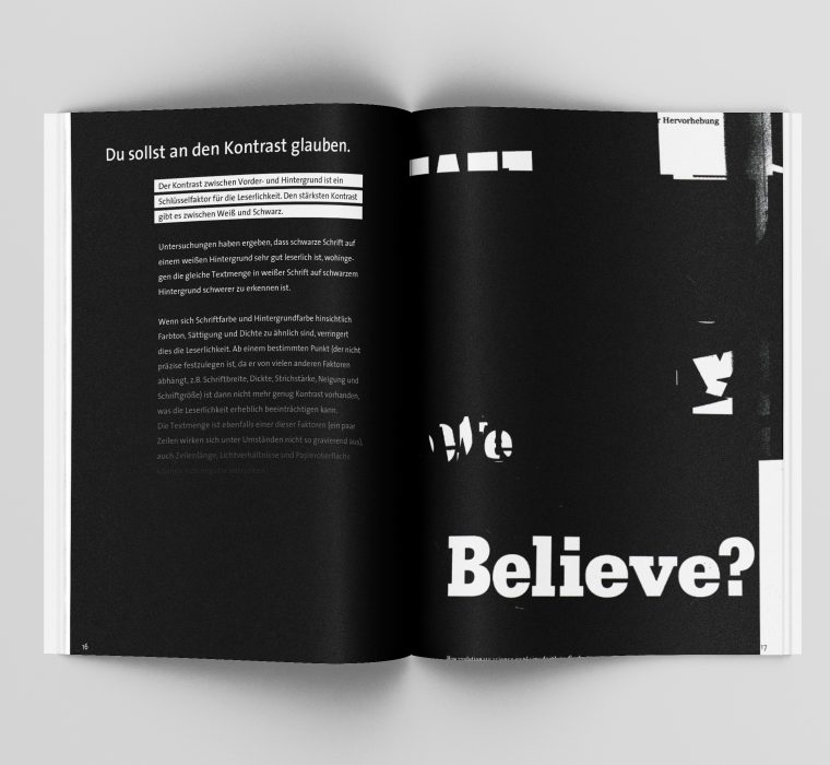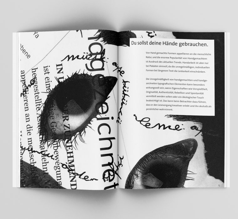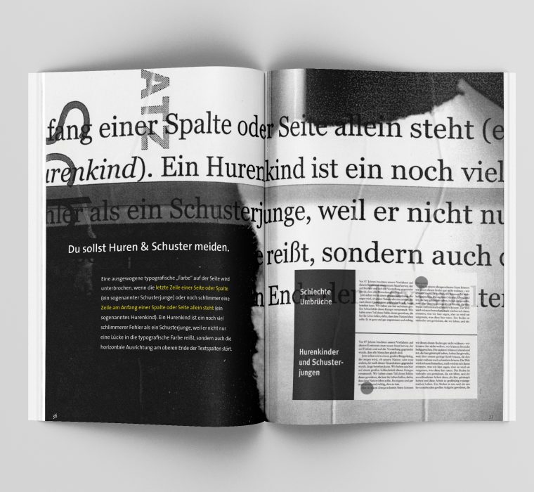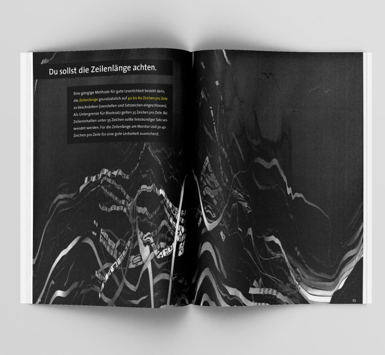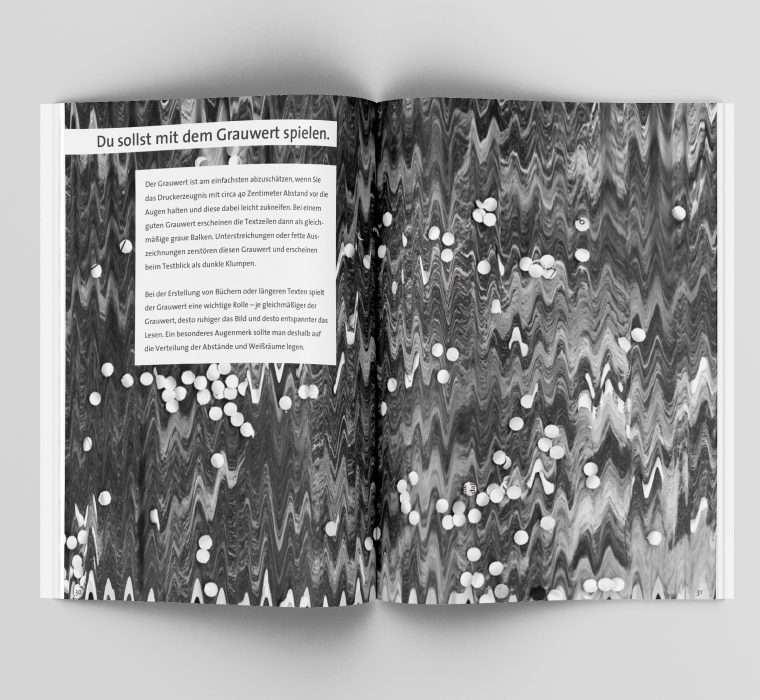 In der Schriftgestaltung gibt es viele Regeln die beachtet werden sollten, um eine gute Darstellung und Lesbarkeit zu erzeugen. 30 dieser Regeln wurden in diesem Gebote-Buch zusammengefasst und mittels Grafiken entsprechend visualisiert. Die grafische Umsetzung wurde allein durch verschiedenen Kopiertechniken erzeugt, welche dabei die typografischen Regeln darstellen.