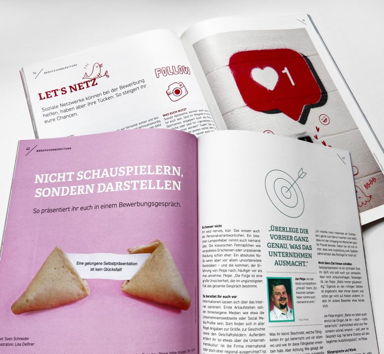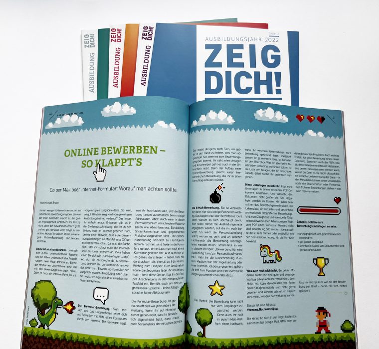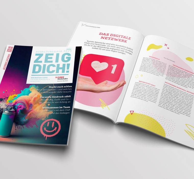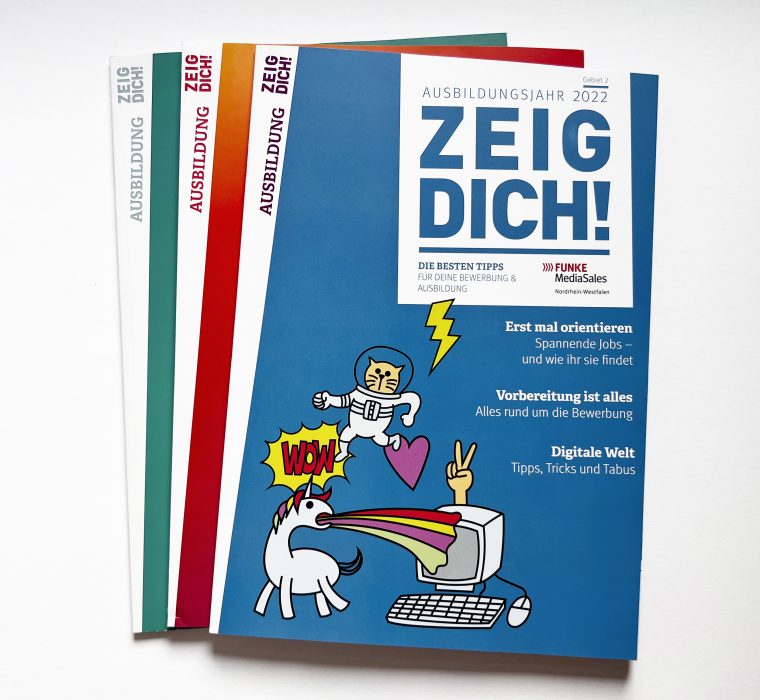 Das Employer-Branding-Magazin „ZEIG DICH!“ ist der Leitfaden für den Berufseinstieg. Es richtet sich an Schülerinnen und Schüler von Abschlussjahrgängen und wird an weiterführenden Schulen im Unterricht in NRW verteilt. Neben dem redaktionellen Teil rund um die Themen Bewerbung und Berufseinstieg können sich Unternehmen mithilfe von Azubi-Testimonials und Anzeigen als Arbeitgeber präsentieren.